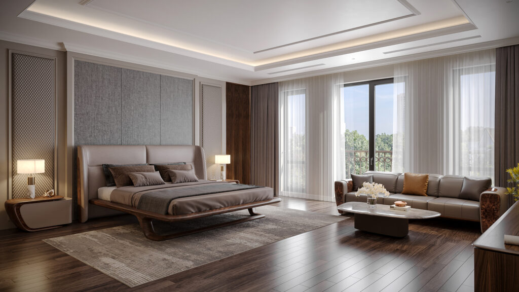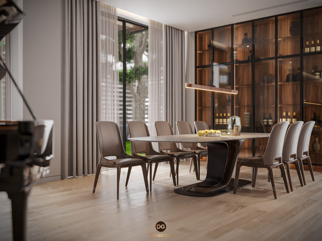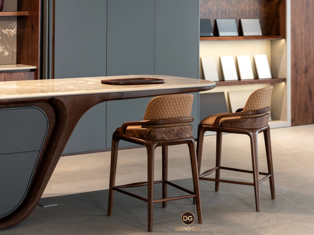 Sự kết hợp phù hợp giữa chất liệu gỗ óc chó và vật liệu đá tự nhiên cao cấp không chỉ đem đến cảm quan tương phản hài hòa về màu sắc cho không gian bếp mà còn đảm bảo độ bền cho sản phẩm theo năm tháng bởi 2 chất liệu quý này.